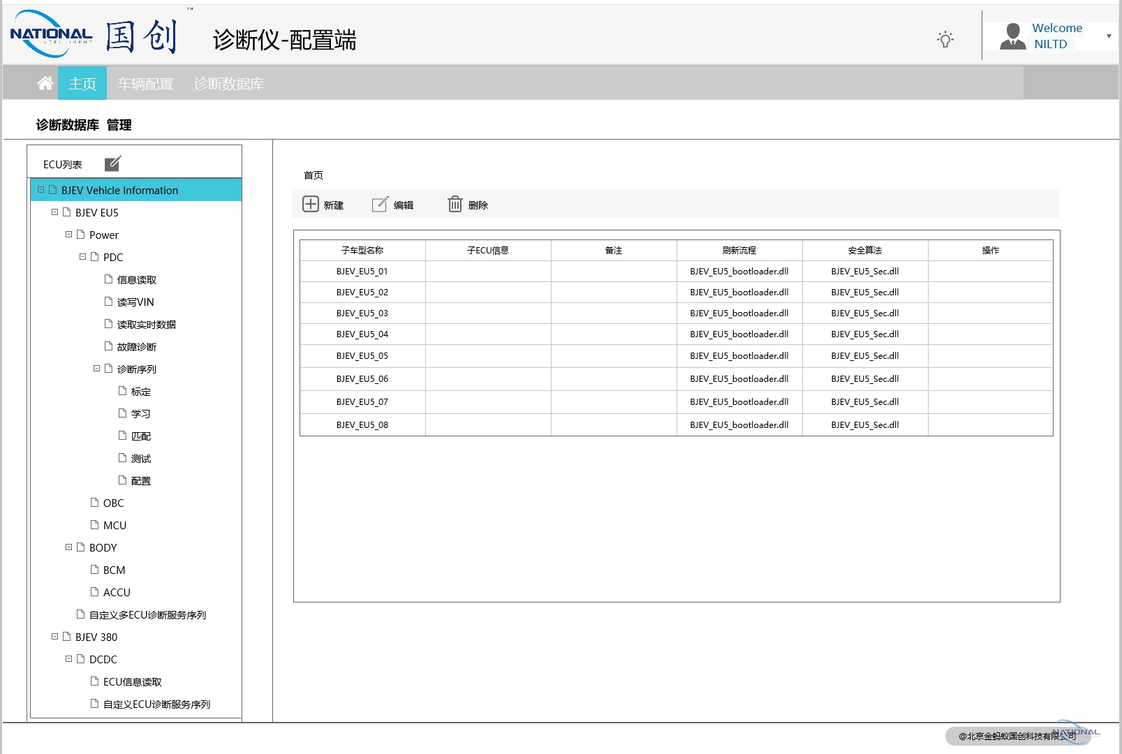 诊断配置管理软件可以导入车型诊断数据库文件、新建车型诊断配置文件。车型数据管理根据车型-网段-ECU分级管理。
