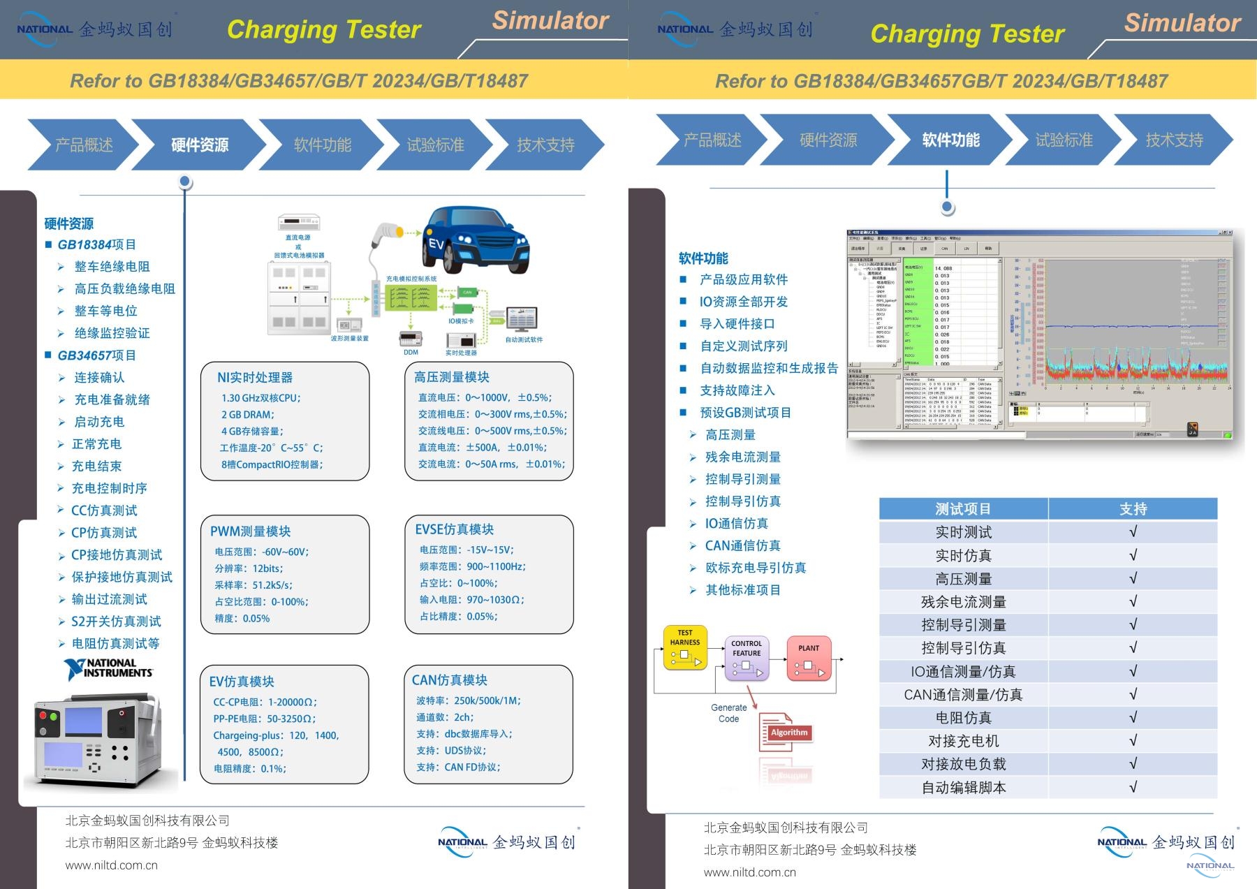 测试系统可以模拟直流充电桩和交流充电桩对整车进行充电放电测试。参照法规要求:《GBT 34657.2-2017 电动汽车传导充电互操作性测试规范 第2部分:车辆》。可满足:40KW直流充电互操作测试;12KW交流充电互操作测试和6.5KW交流放电测试。